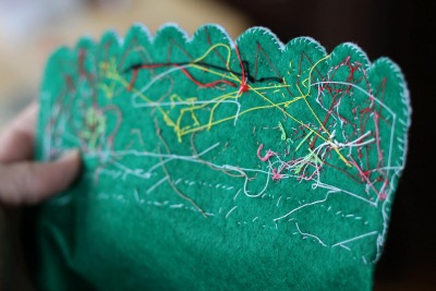As I was sitting on the couch last evening, trying not to tangle embroidery floss around beads and sequins and feeling quite inadequate about my skills as a stocking maker, I looked down to see the mess of stitches and knots on the back side of the felt.